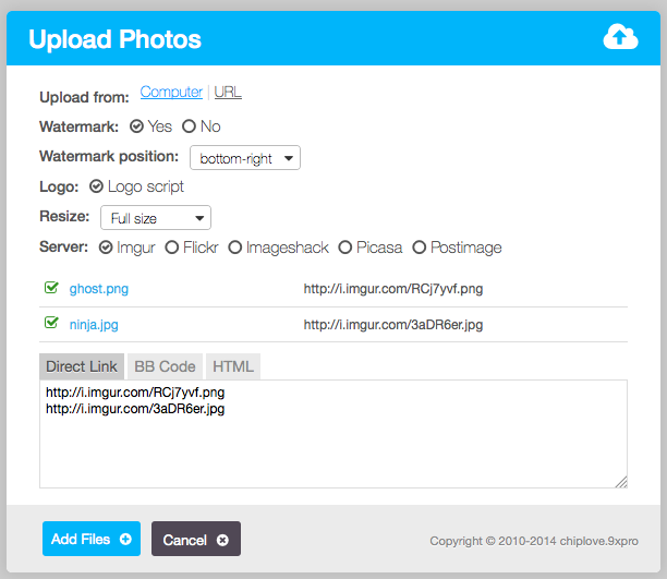 Tải hình ảnh từ máy tính của bạn, URL với một số dịch vụ lưu trữ như Imgur, Picasa, Imageshack